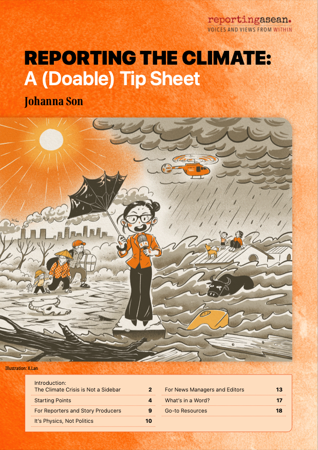 A tool for journalists and storytellers by Reporting ASEAN's Johanna Son (illustrations by Chan Thinh). This 44-page tool focuses on the concepts and terms that a journalist, or any communicator will find handy for reportage, analysis, and further inquiry into today's most urgent stories - the climate emergency and the sustainability crisis. The project is implemented by Reporting ASEAN Sustainability Series project, hosted by PMFI and supported by the Heinrich Boll Foundation Southeast Asia.